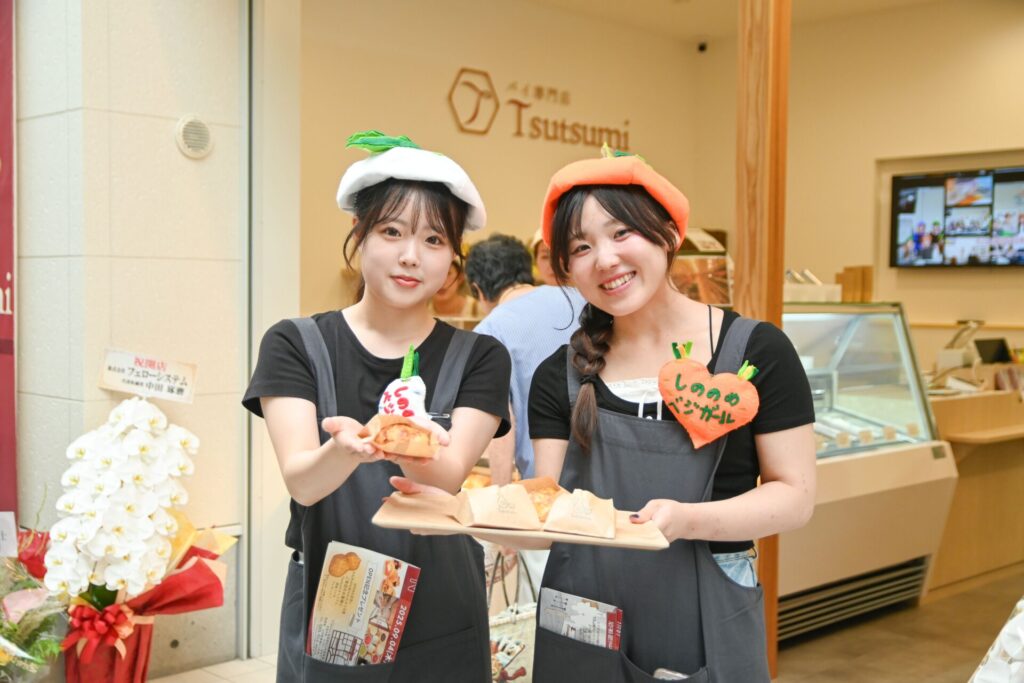 オープン当日は、しののめベジガールの学生たちが店頭に立ち、観光客の皆さんにチラシを配布しながら、商品の魅力を元気にPR!