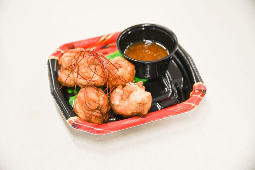 本商品は、愛媛県産「伊予いも豚」のこま肉を丸めてカリッと揚げ、「河内晩柑」を使ったフルーツソースとともに味わう油淋鶏風の惣菜です。お肉にもソースにも地元食材を使用し、学生たちはソースの香りや甘みにこだわって試作と改良を重ねてきました。