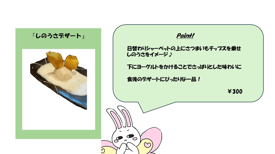 ・商品開発をする中で、自分たちならではのオリジナリティを出したり、メニューの値段やソースの組み合わせなどの細かい設定を考えたりするのと、店舗に設置するPOP作りを頑張ることが出来ました。(商品開発チーム:Mさん)