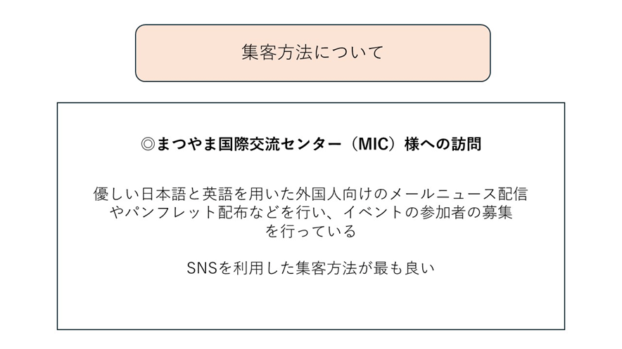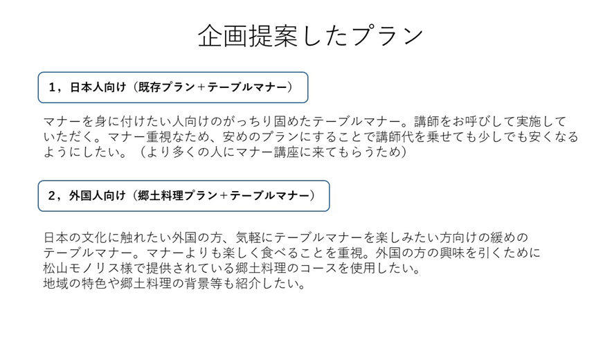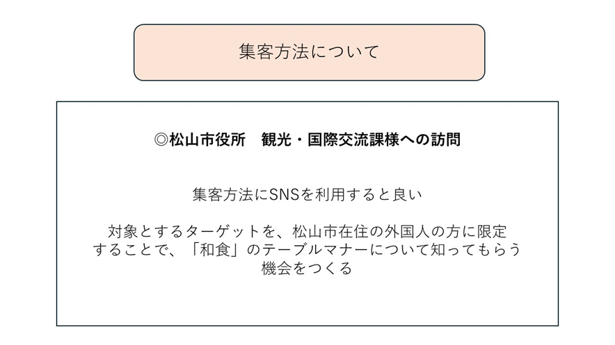 式場利活用チームは、結婚式場という特別な空間を活かした企画づくりに取り組み、「和食のテーブルマナー講座」の企画提案を行いました。今年度中には実現に至りませんでしたが、松山モノリス様をはじめ、愛媛県庁、松山市役所、まつやま国際交流センターの方々から多くのアドバイスを頂きました。運営方法や集客の工夫など、企画を実現するために何が必要なのかを具体的に考えるきっかけとなり、学生たちは、次につながる多くの気づきを得ることができたようです。