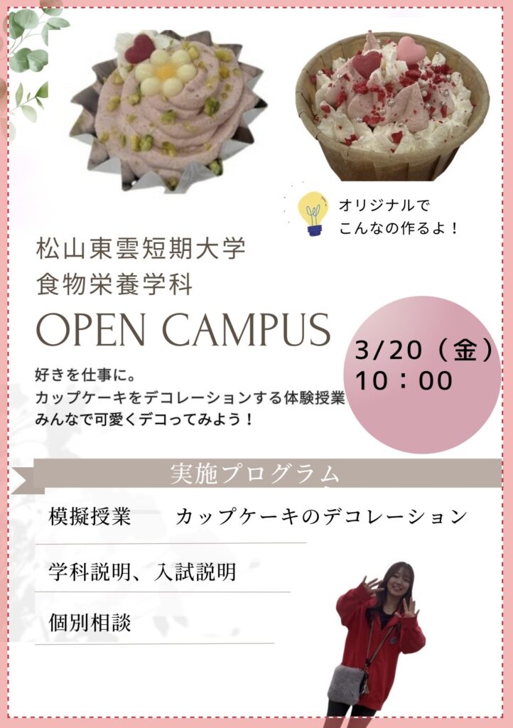来月3月20日(金・祝)10:00~14:00の食物栄養学科のオープンキャンパスは、