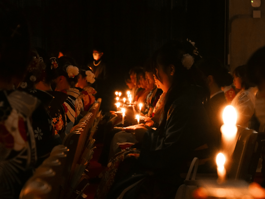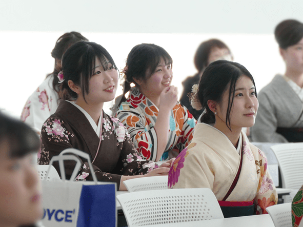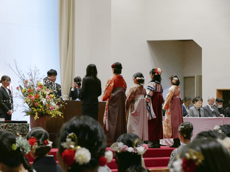 式では、現代ビジネス学科の学生が短期大学卒業生を代表して答辞を述べ、これまでの学びを振り返り、支えてくださった方々への感謝とともに、それぞれの未来に向かって歩んでいく決意を述べました。