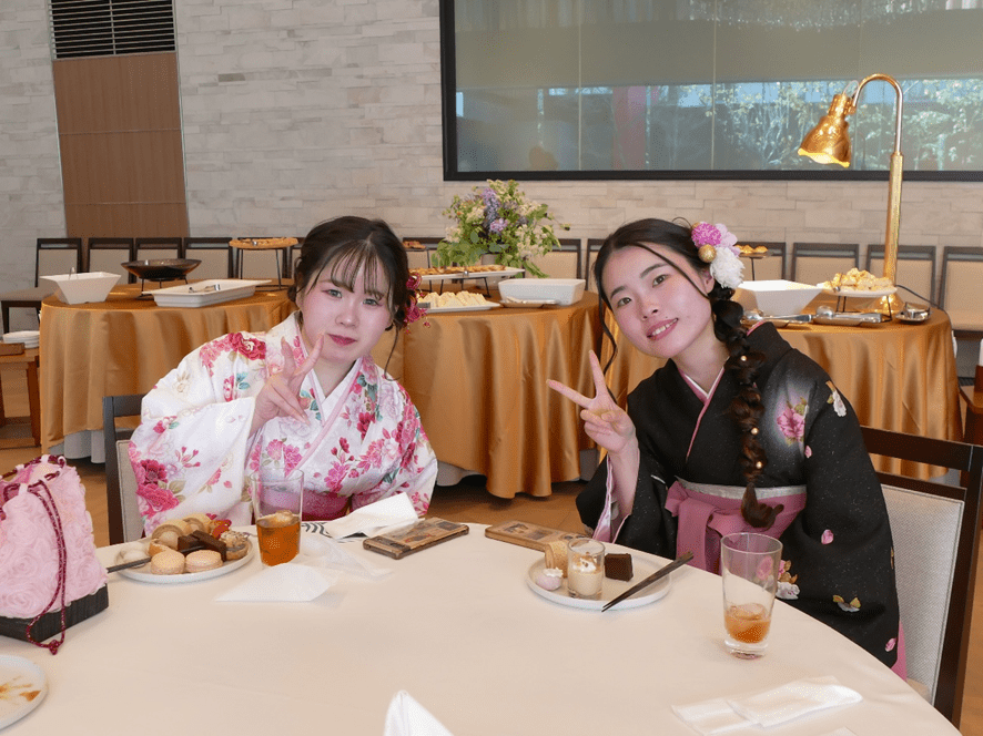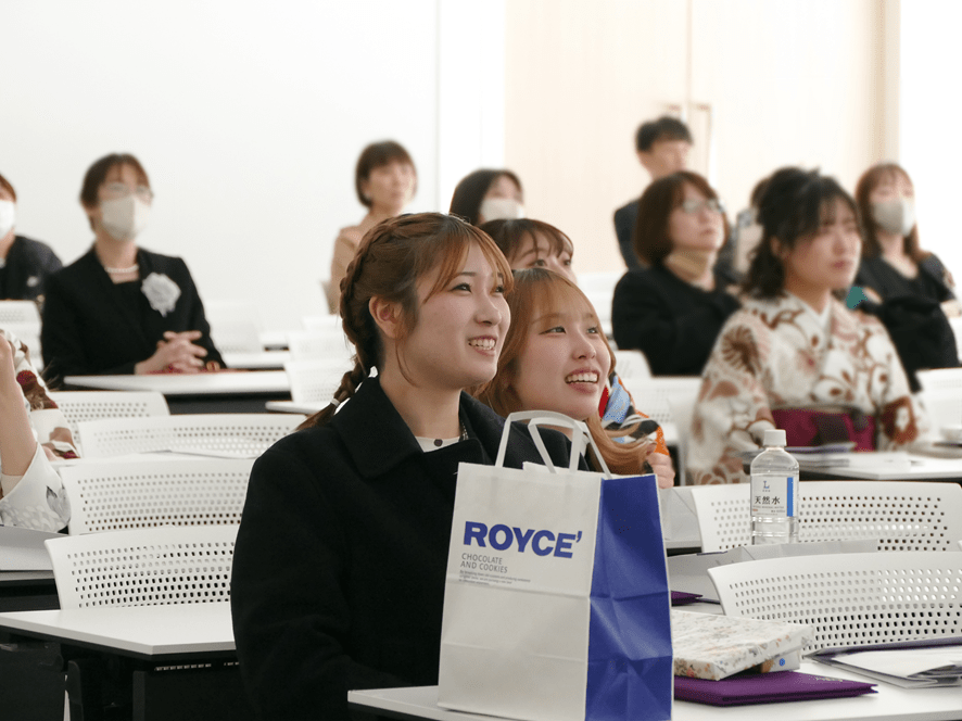 現代ビジネス学科では、学科教職員から卒業生へのプレゼントとして、短期大学での2年間を記録した動画が贈られました。授業やプロジェクト活動、学科イベントなど、さまざまな場面が映し出されると、会場には懐かしそうな笑顔や笑い声が広がりました☺✨