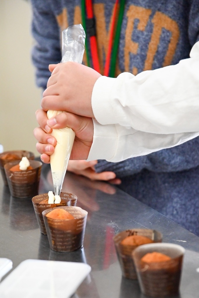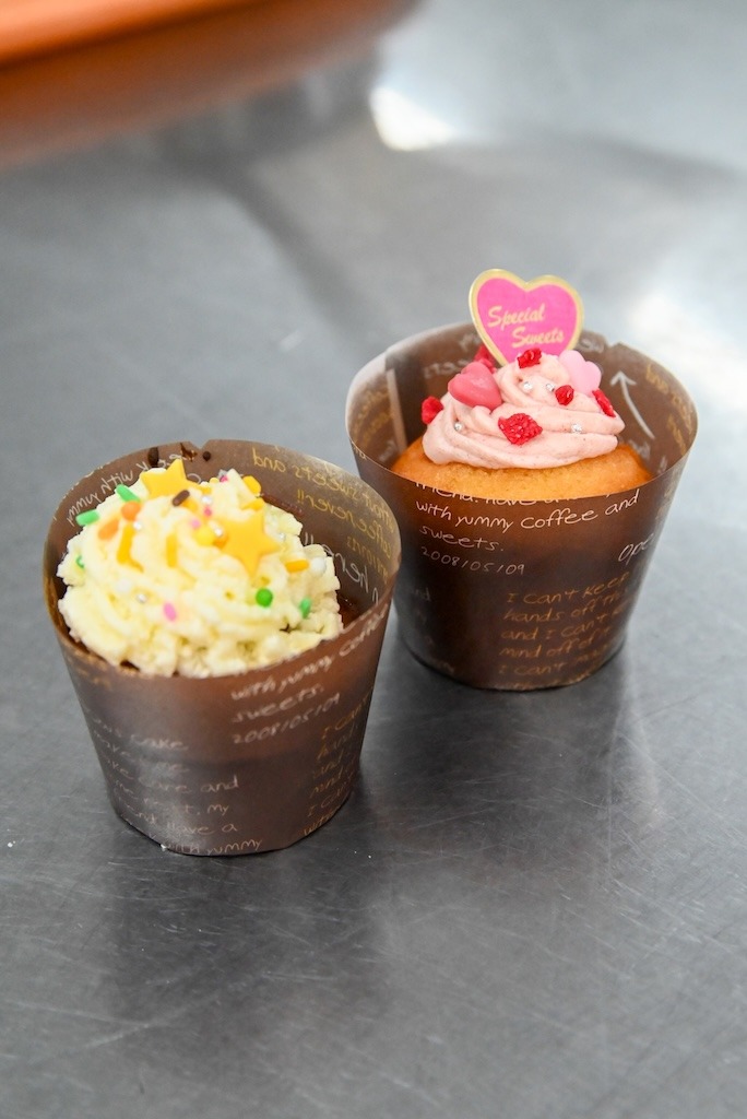 いおやつであるカップケーキにクリームやトッピングをのせて、思い思いにデコレーションしながら、楽しく調理の体験をしていただきました。会場には笑顔があふれ、和やかな雰囲気の中での実習となりました。
